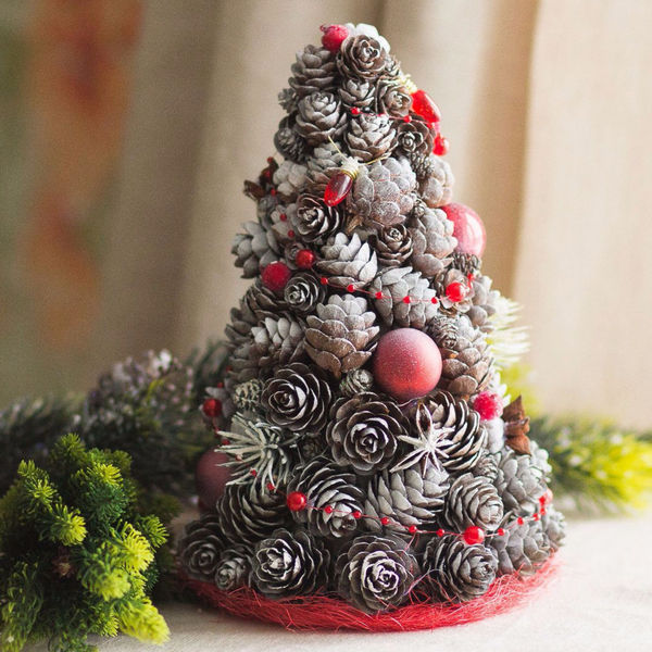 Елочная игрушка выполнена из пенопластового шарика, обклеенного сосновыми шишками. Шишки покрашены местами белой гуашью для имитации снежного покрова. Декорированы блестящими снежинками под серебро и красными бантами из атласной ленты с белыми бусинами расположенными в хаотичном порядке. Из бечёвки сложен рождественский ангел, что украшает ёлочный шар. При помощи петельки новогодний шар можно повесить на ёлку.