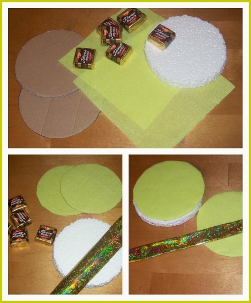 Вместо пенопласта используют коробки от конфет с откидывающейся крышкой. Покрывают коробку золотой гофрированной бумагой, а на неё укладывают на двусторонний скотч конфетки