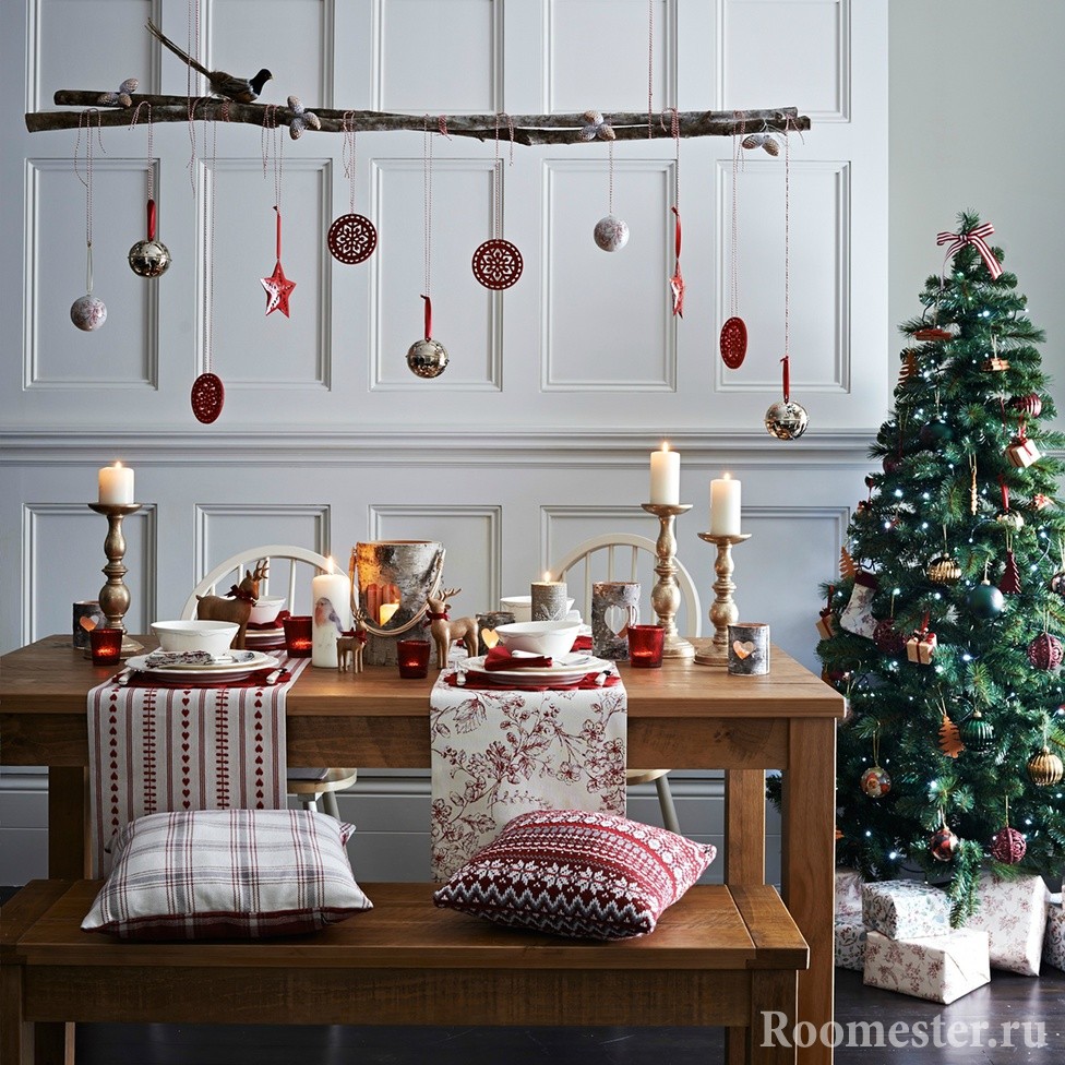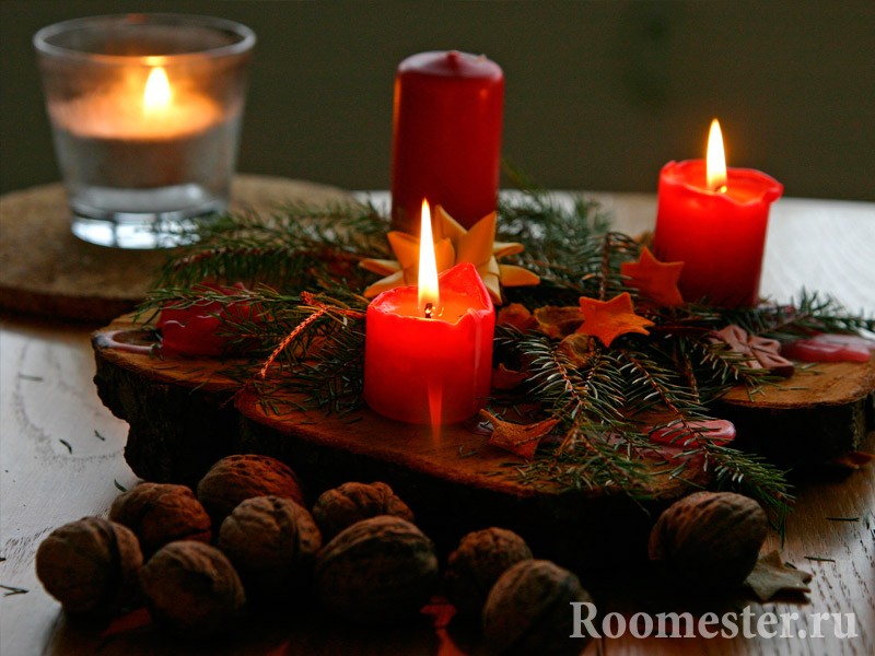 Для того чтобы не менять привычную обстановку, но, вместе с тем, внести торжественную нотку, купите ароматные свечи, несколько еловых веток, с помощью красных салфеток. Все эти аксессуары стильно сочетаются друг с другом и могут использоваться отдельно.