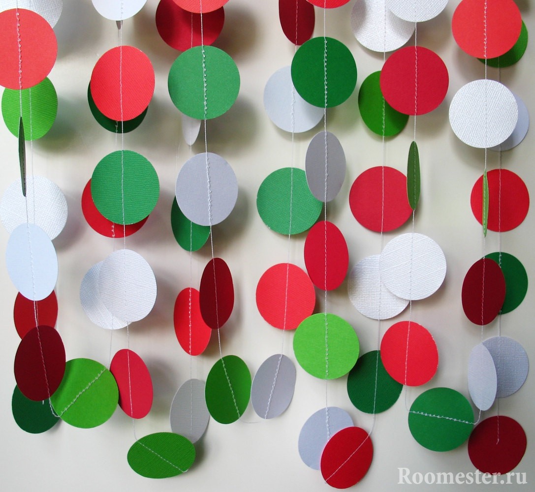 Собственноручно сделанные из цветной бумаги, шаров и других доступных всем материалов елочные гирлянды можно разместить на балконе либо по периметру окна.