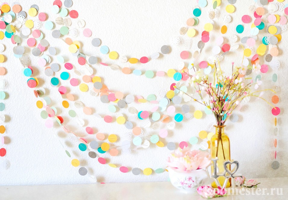Новогодний декор необходим и стенам. Выручат крупные конфетти, сделанные своими руками. Такой способ подойдет, если у вас в доме однотонные стены. Прикрепив к ним яркие кружки из цветной бумаги, вы создадите впечатление, будто в комнате взорвалась огромная хлопушка.