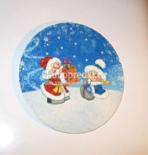 В конце нужно прикрепить изделие на мочалку, которую использовали при его создании, или на плоскую дощечку. Для этого смажьте ее клеем и прикрепите снеговика, а оставшееся пространство украсьте ватой, дождиком и блестками.