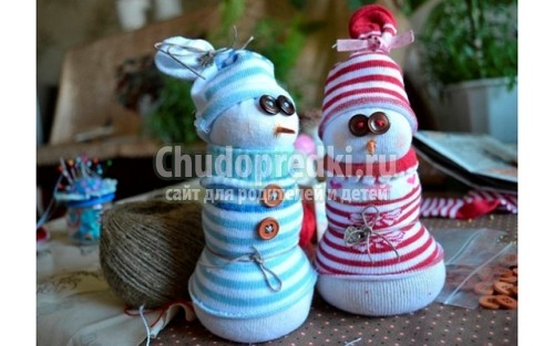 Один из главных персонажей Нового года – снеговик. Сделать эту фигурку очень просто. От двух пенопластовых шариков отрезаем нижнюю часть. Соединяем их и надеваем шапочку, шарф и рукавички. Рисуем лицо и крепим морковку.