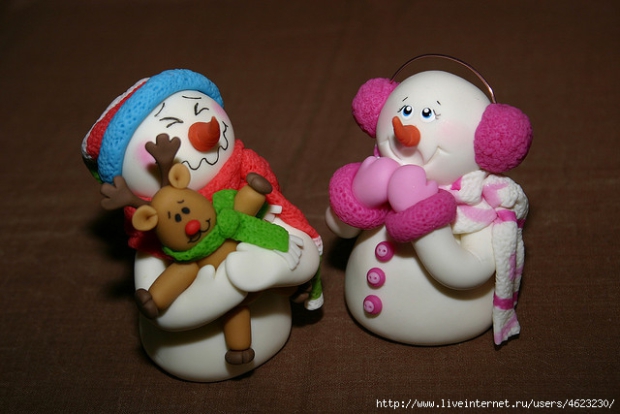 Такая нежная и милая поделка понравится девочкам. Из полимерной глины формируем шарик и овал. Чтобы уменьшить расход материала и сделать изделие более легким, внутрь помещаем фольгу. Соединяем голову и туловище шпажкой. Лепим ручки в виде капелек, сиреневый шарфик и сердечко. Прикрепляем глазки, нос морковкой и щеки. Готовую и полностью просохшую поделку сажаем в коробку.