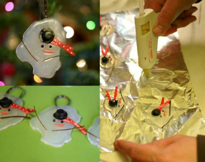 И еще вариант поделки для уличной елки из подручных материалов. Отрезаем дно от бутылки и придаем ему красивую форму. Гуашью или блестящими контурами рисуем узор. Продеваем ленточку в отверстие и простая поделка в школу готова.
