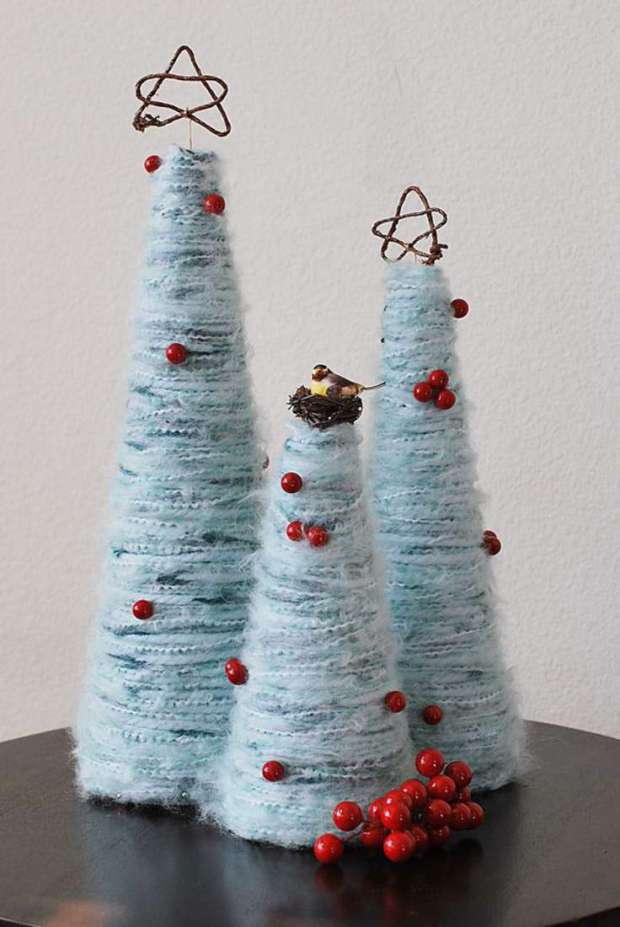 4. Уютной и милой смотрится новогодняя красавица, выполненная из толстой пряжи и швейных ниток. Смастерив такую мягкую красавицу на новый 2017 год, ваше жильё наполнится теплотой и комфортом праздничного вечера.