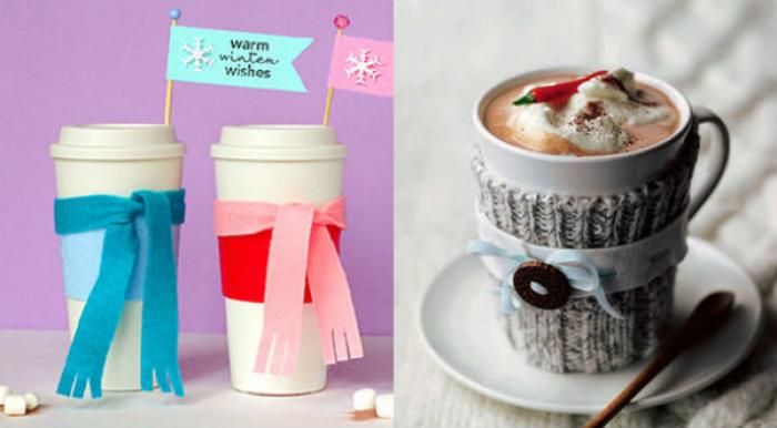 Если шарфики декоративны, то манжеты от свитера сохранят тепло кружки и не дадут обжечься.