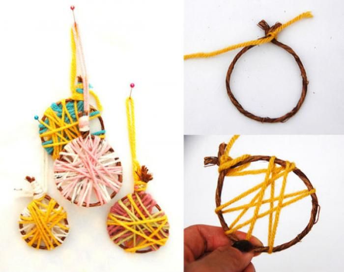 Эта поделка в школу достаточно необычная, но очень эффектная, а процесс ее создания понравится любому ребенку. За основу будем использовать пластиковую тарелку или крышку. Макетным ножом вырезаем ровный треугольник. Вдоль боковых ребер делаем круглые отверстия. С этим поможет справиться дырокол. Теперь, продеваем зеленую нитку и поочередно вставляем ее в отверстия, начиная сверху. Украшаем елку на свой вкус.