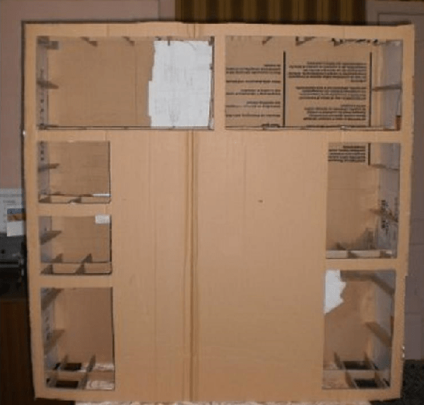 В качестве задней стенки служит дополнительный кусок картона. Он должен быть достаточно широким. Размер фрагмента не должен быть вровень с размером топки. Вырезать картон необходимо с существенным запасом. Задняя стенка необходима в том случае, если камин изготавливается из сборных коробок. В большой коробке задняя стенка уже имеется.