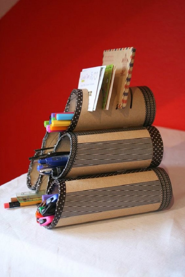 Если вам нужно место для хранения карандашей, ручек и других канцелярских принадлежностей, из рулонов от туалетной бумаги можно сделать вот такой аккуратный органайзер. Баллончик с краской плюс несколько втулок приклеенных к куску картона.