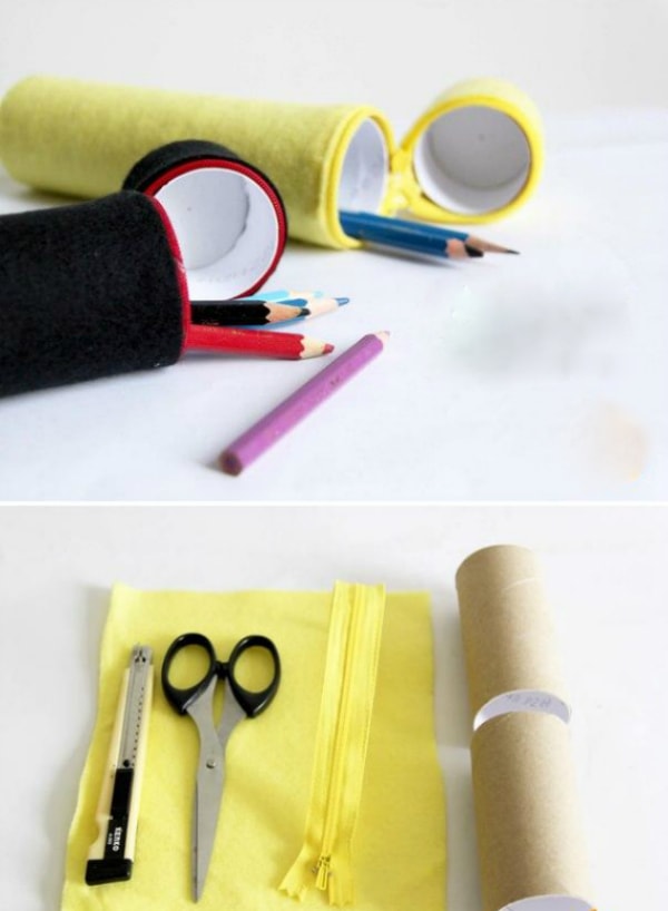 Место разреза нужно хорошо закрепить клеем в тех местах, где будет проходить молния, чтобы втулка не вылезала через отверстие каждый раз, когда будет открываться пенал. Получается очень полезная вещица, в которой можно хранить канцелярские принадлежности, кисти для рисования и т.д.