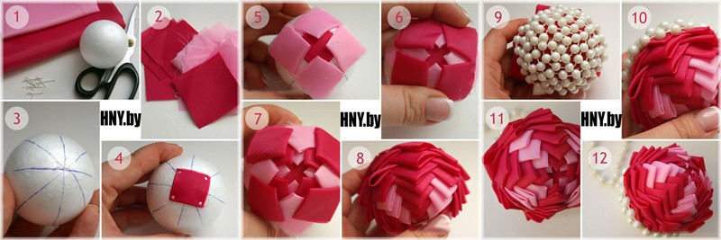 - Изделие нужно украсить с помощью лент, бусин и цветочков из ткани. А для подвески следует пришить веревочку. Получилась елочная игрушка, непохожая своей оригинальностью ни на какие другие. Для детей такой вариант поделки из воздушных шаров на Новый год 2022 своими руками изготовленный придется по душе.