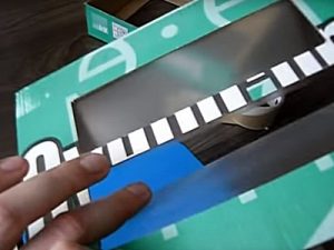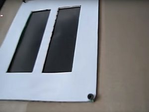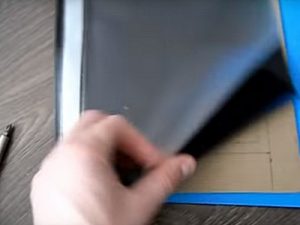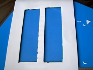 Линии разметки нанесены. По ним вырезаются два окошка, причем симметрично. Сквозь них станет поступать воздушный поток. Выкраивается два эластичных лепестка из пленки, что будут служить мембранами. Эти лепестки крепятся надежным клеем на картонное основание (по его внешним краям).
