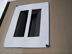 ![]() | Затем по линии разметки врезается прямоугольник. При необходимости – проводится точная подгонка, так, чтобы решетка и картонный фрагмент точно совпали по внешней границе. |