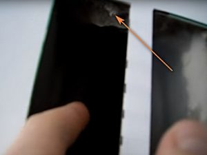 ![]() | По нанесенным линиям разметки вырезаны два симметричных окошка, через которые буде пропускаться воздушный поток. Производится примерка пленки для раскроя двух эластичных лепестков – мембран (пленка плохо заметна на иллюстрации, поэтому показана стрелкой). |