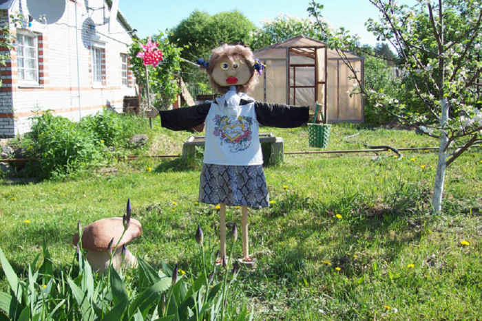 Достаточно эффективно с этим помогает бороться пугало на участке. Сделать чучело можно самостоятельно. Оно может выполнять не только отпугивающую, но и декоративную функцию.