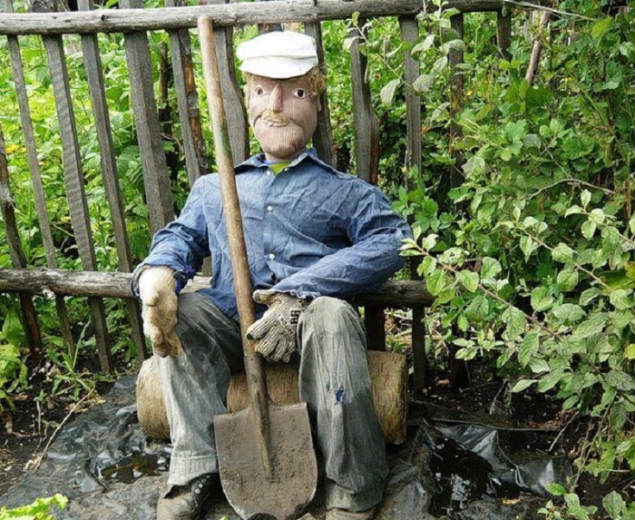 Если изготовить несколько сторожевых фигур, можно одновременно защитить все уголки участка, включая территорию у входа в дом. На большом участке одной фигурой не обойтись. Чтобы чучело, сделанное своими руками, хорошо держалось в почве, нижний конец его каркаса делают заострённым.