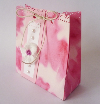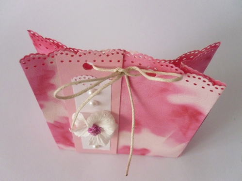 Клеим бумажную заготовку справа на пакетик так, чтобы ажурный край от розовой полосы совпал с краем пакетика. Отмечаем места, где будем пробивать отверстия. Они не должны затрагивать складки внутри пакета.
