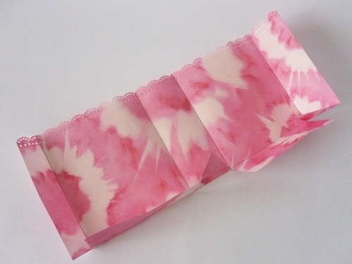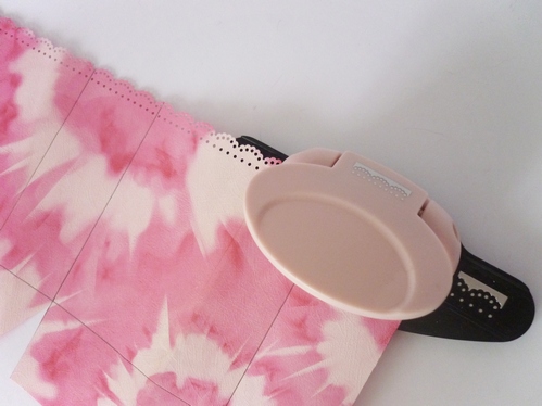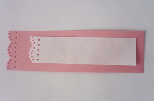 Теперь вырезаем две полосы. Одну из розового картона размером 3х10,5 см, а вторую из белого размером 2х8 см. Один край каждой полосы обрабатываем фигурным дыроколом. Клеим белую полоску на розовую так, чтобы от каждого края были одинаковые отступы.