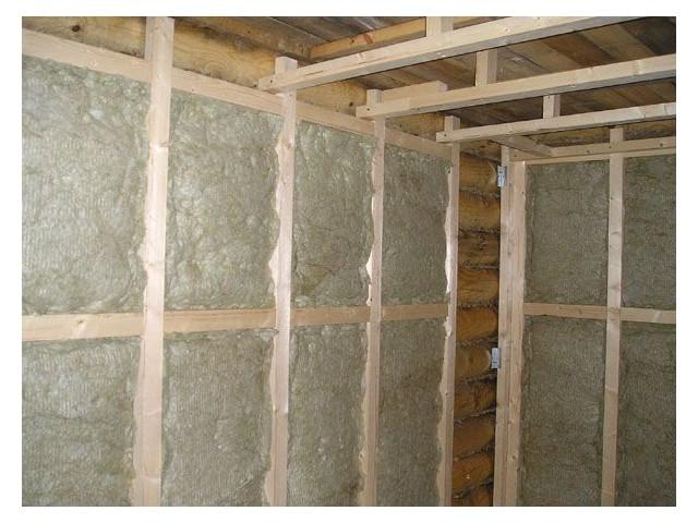 - Заполняем каркас слоем утеплителя. Для этого лучше всего подходит любая минеральная вата, она не боится горячей температуры и не горит. Перед установкой утеплителя желательно закрепить слой пароизоляции.