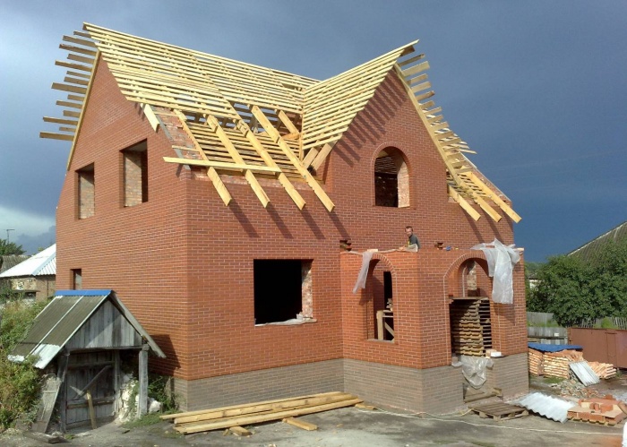 Когда стены будут готовы, нужно будет начинать строительство крыши дома. Специалисты рекомендуют для кирпичных домов использовать вальмовую и двухскатную, мансардную, а также шатровую крышу.