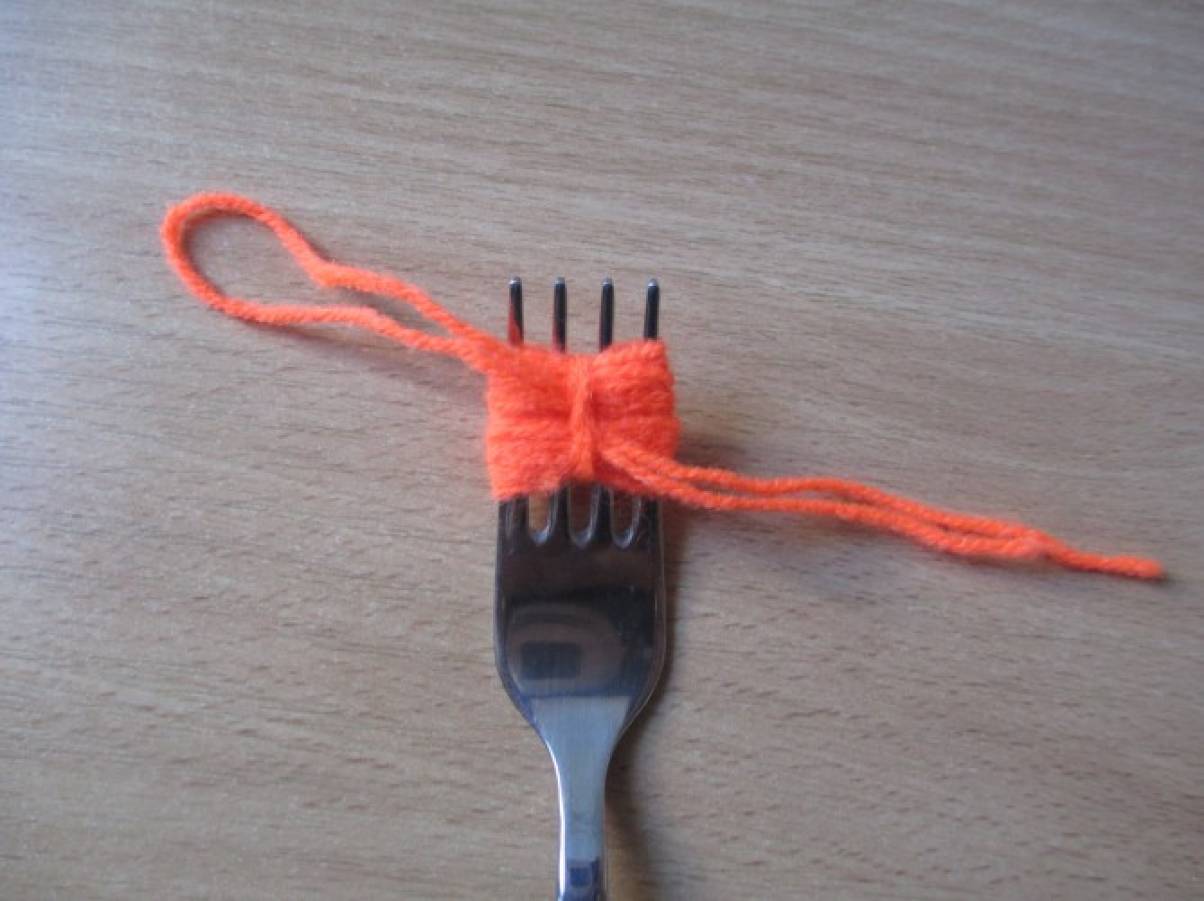 Затем завязываем нитку посередине как можно крепче и снимаем получившийся бантик с вилки.