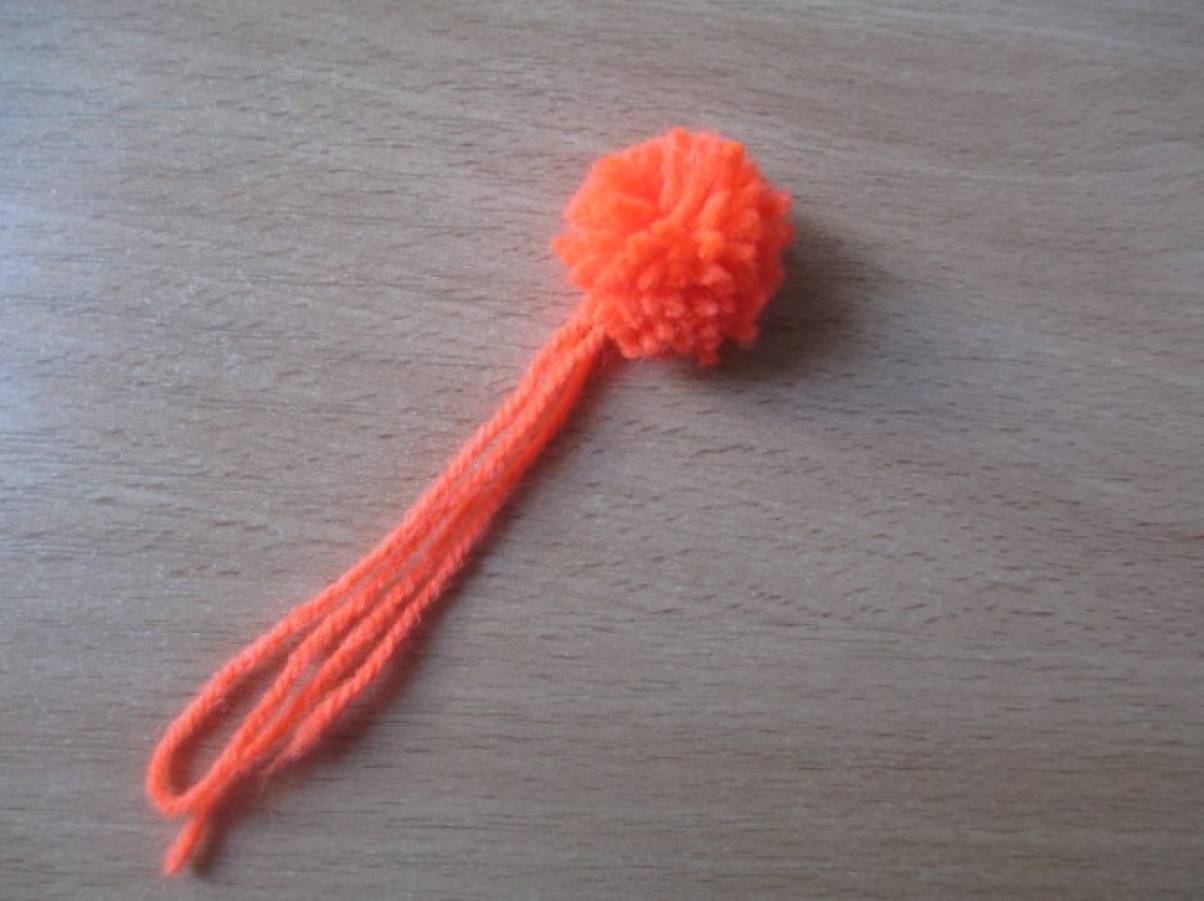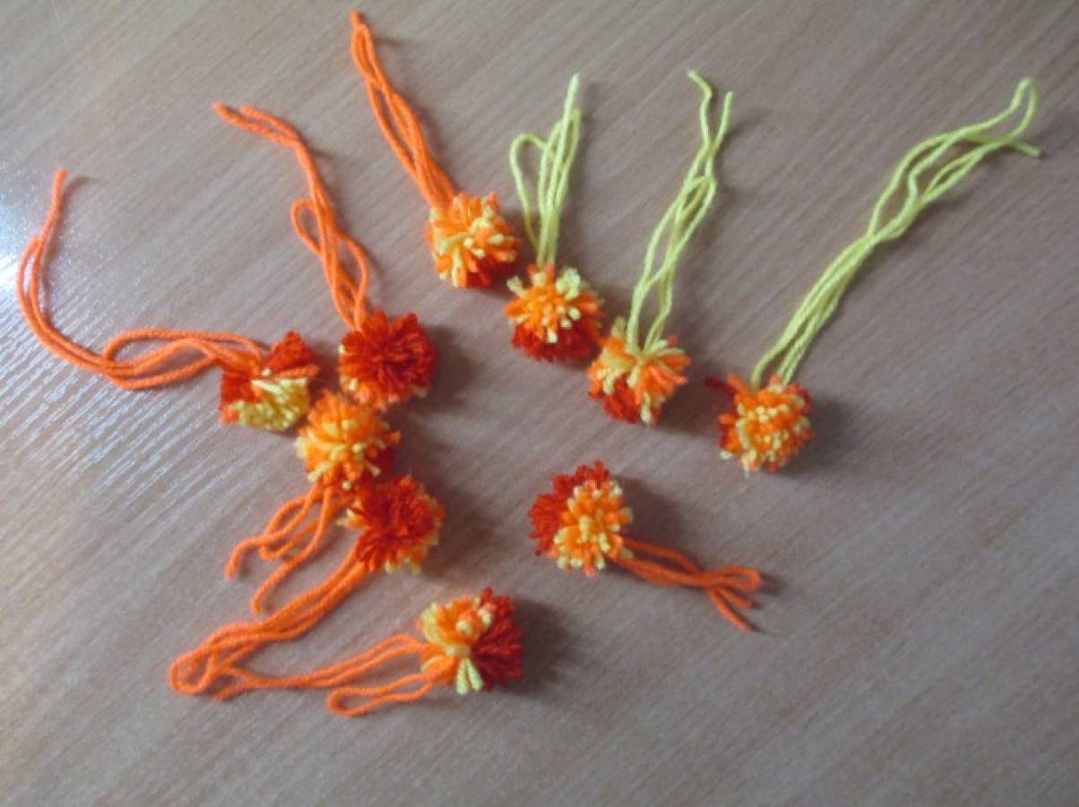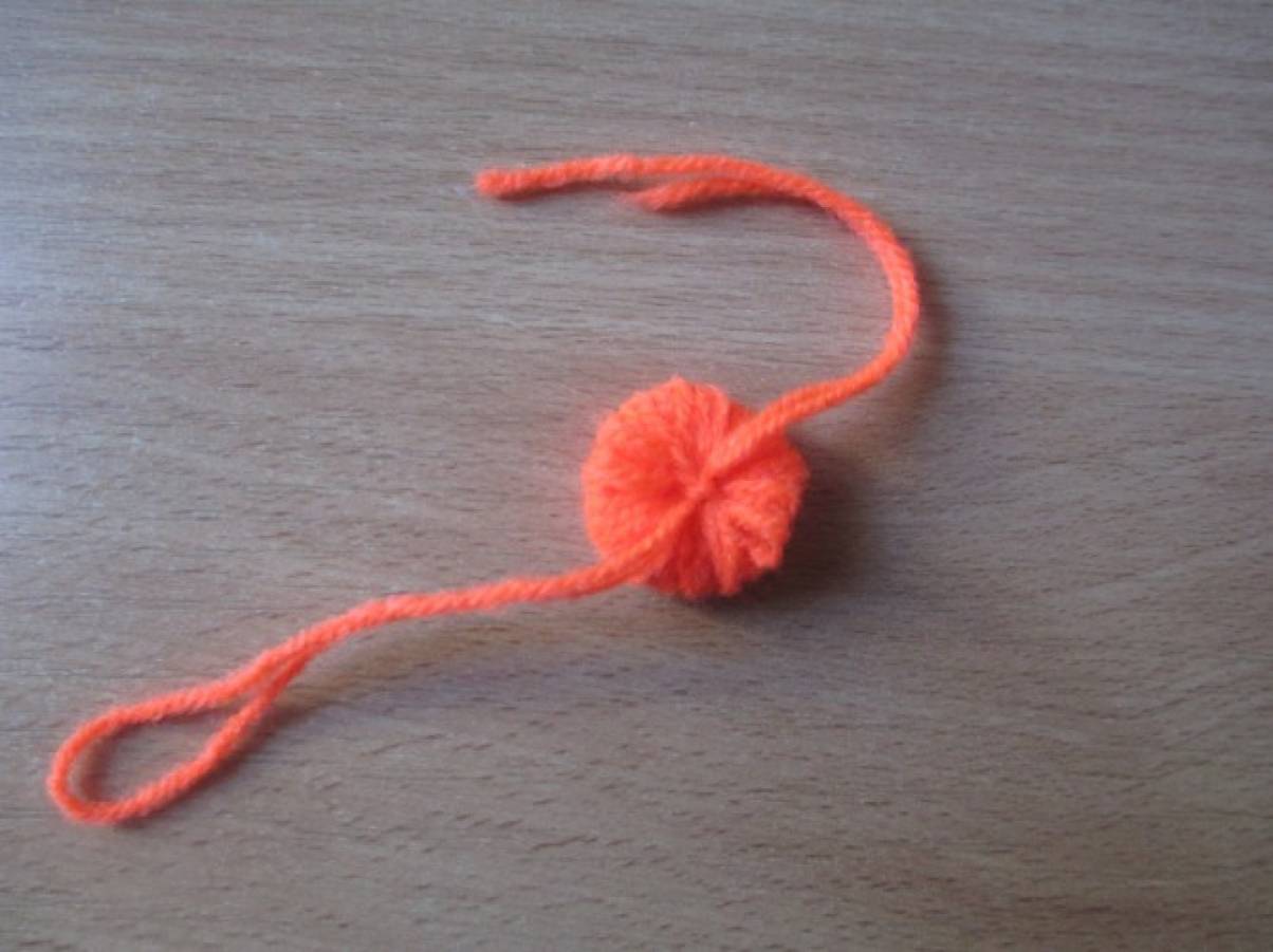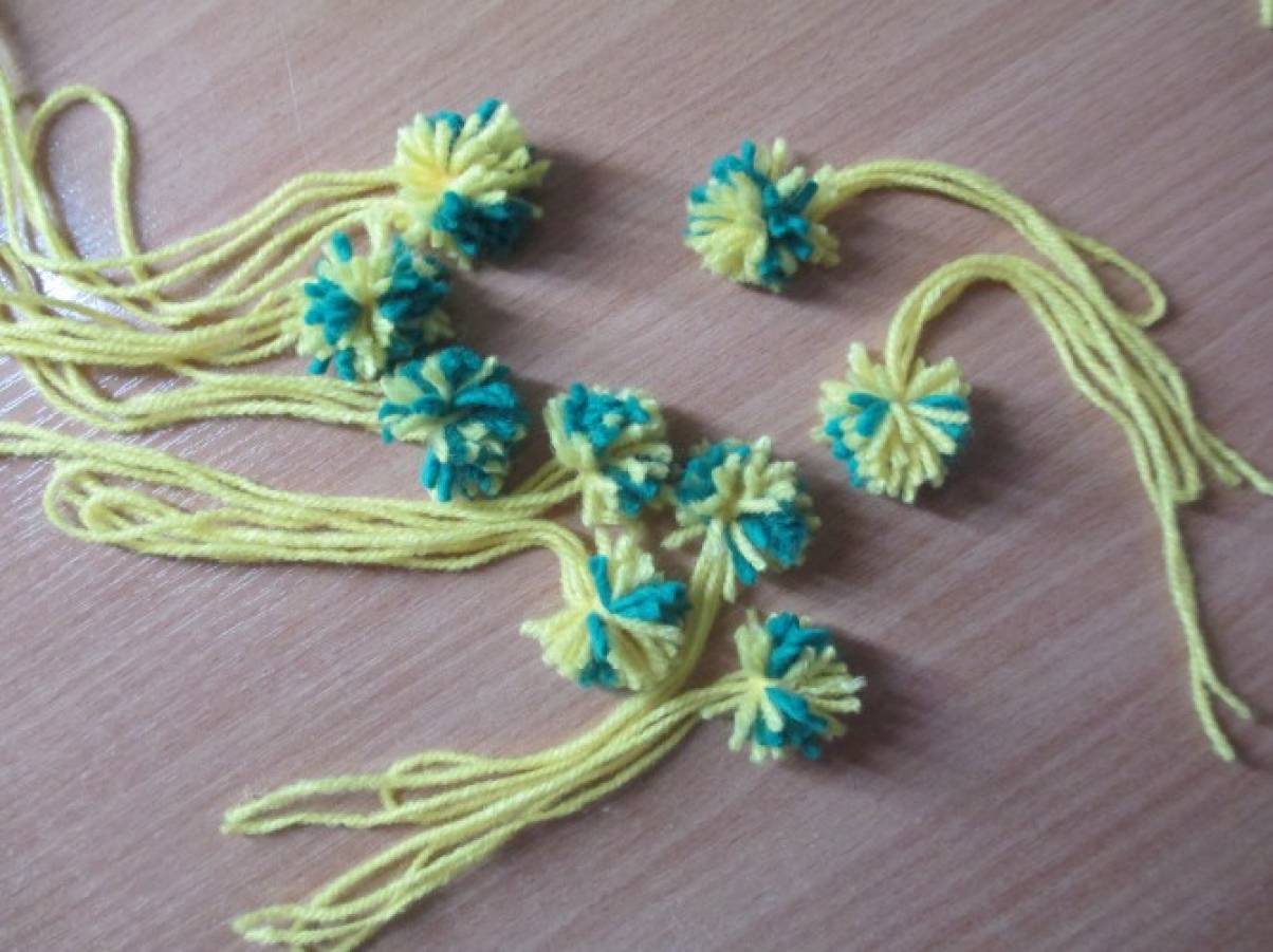 После этого бумажный шар обматывается нитками, убирая неровности за счёт их стягивания. Получается плотный ровный шар, к которому затем привязываются помпоны (листва). Диаметр шара – 12 см.