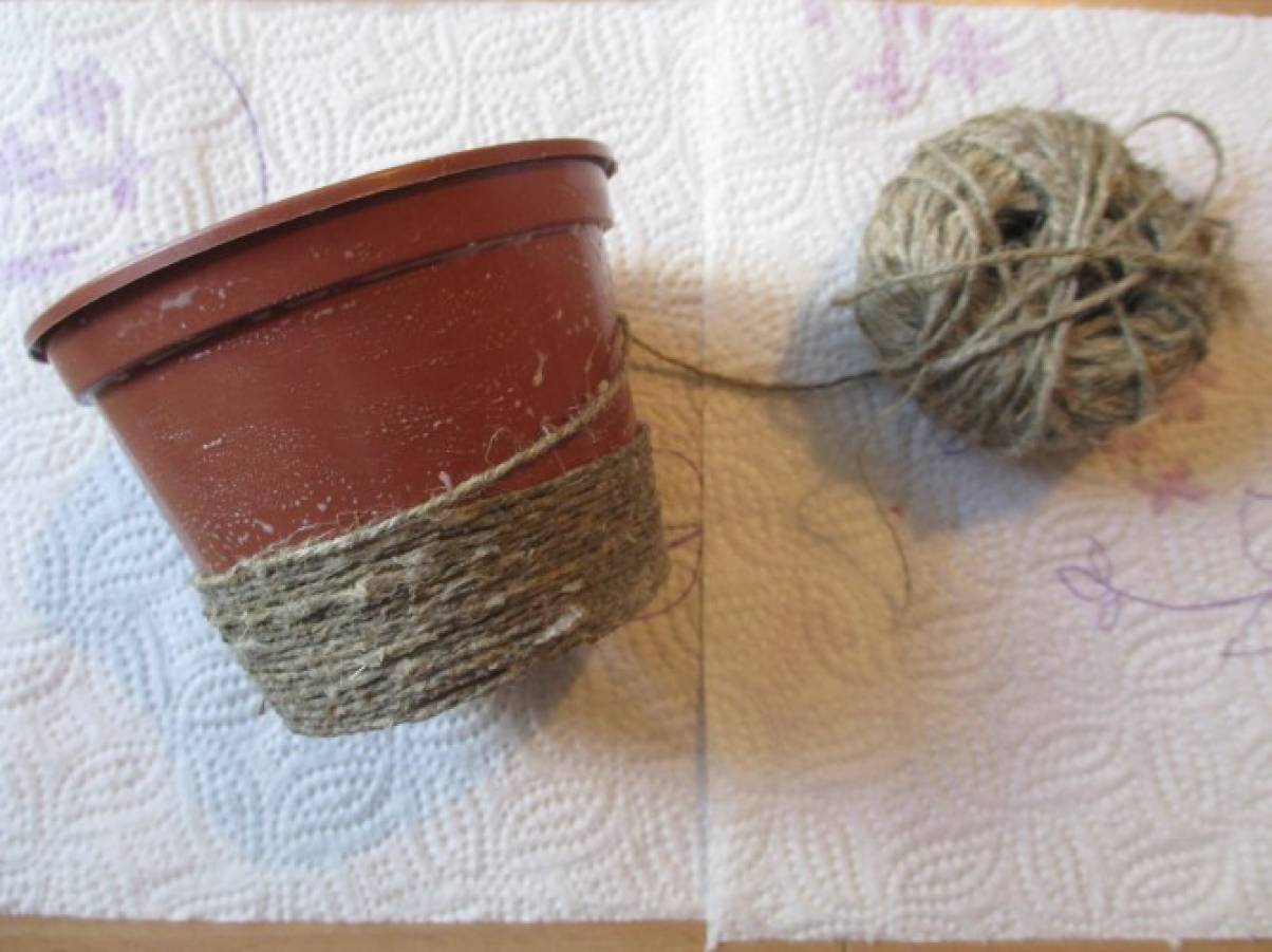 Пластмассовый горшочек для рассады (подставку для топиария) намазываем клеем ПВА и обматываем шпагатом. Виток должен располагаться близко к витку. Оставляем горшочек сохнуть примерно на сутки.