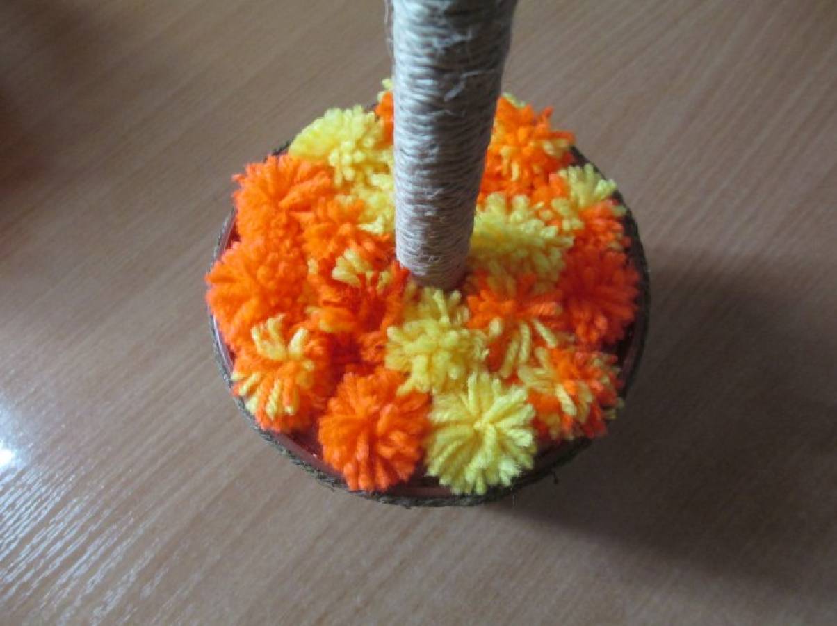 Основу топиария оформляем тоже с помощью помпонов из пряжи. Приклеиваем их к основе клеем ПВА.