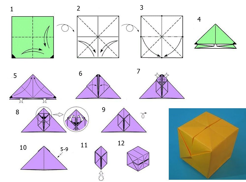 На первой фотографии вы можете увидеть то, что у вас получится, если вы будете следовать схеме сборки, приведенной ниже. Вторую фотографию оригами кубика сделал один из наших пользователей сайта. Его кубик больше напоминает водяную бомбочку. Если у вас есть фото собранных вами оригами, присылайте их на адрес Этот адрес электронной почты защищен от спам-ботов. У вас должен быть включен JavaScript для просмотра.