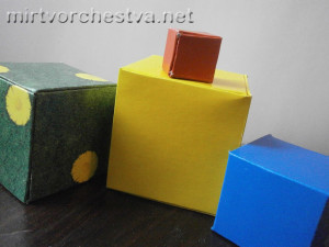 - Вырезаем заготовку и склеиваем ее в готовый кубик маленького размера. Также изготавливаем еще 7 заготовок, одинакового размера.