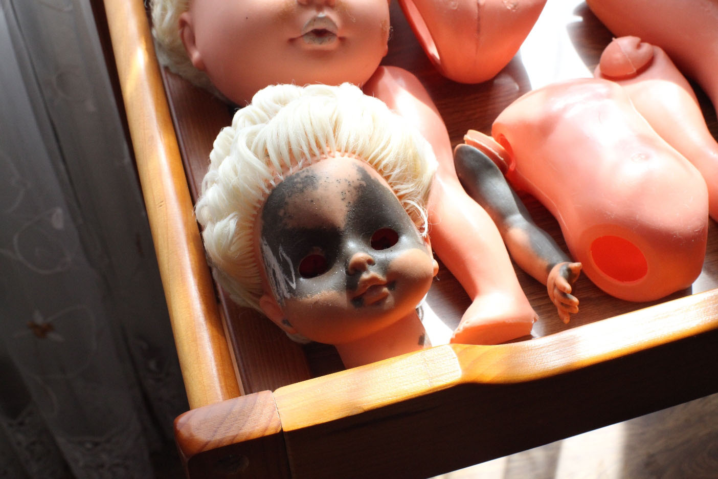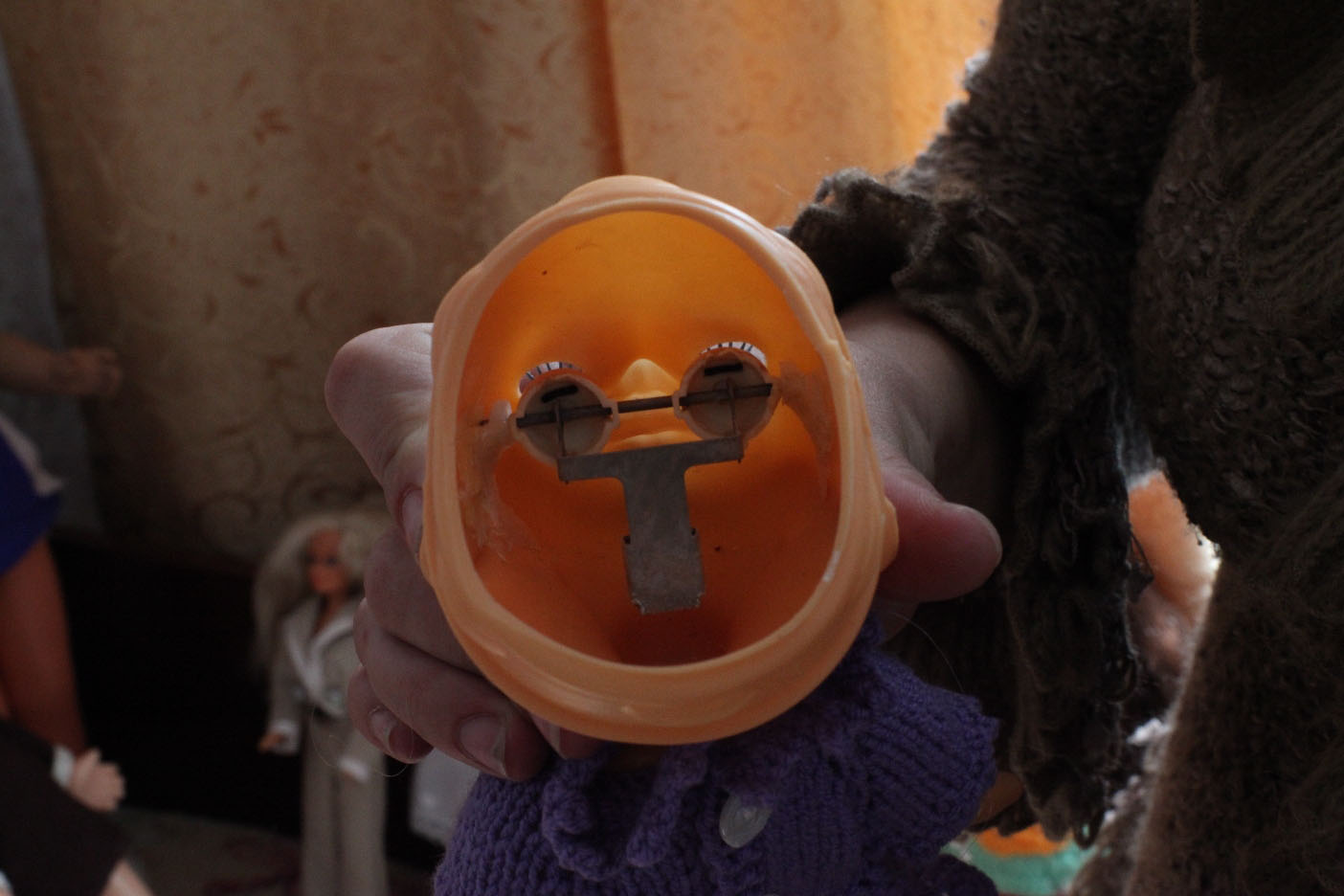 Были потеряны крепления для ног, глазной механизм «провалился» в голову, ресниц почти не осталось, парик свалялся, на боку туловища трешина, одежды и обуви нет……