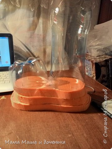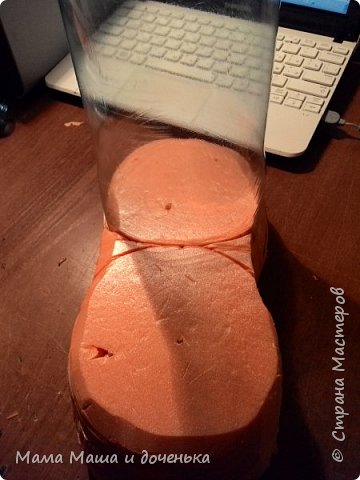 И так приступим, отрезаем у бутылки горлышко и донышко, это будет голенище и нос сапожка. Далее из пеноплекса я вырезала подошву сапога, по размеру бутылки, как на фото. Но можно и на обычном плотном картоне обвести. После чего я склеила пеноплекс между собой и скрепила зубочистками для прочности. использовала я 3 слоя пеноплекса, чтобы была высокая подошва. Очень удобный материал пеноплекс в работе, и очень дешевый.