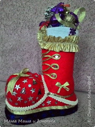 Всем привет, вот такой интересный сапожок Деда Мороза сделали мы с дочкой в преддверии праздника.