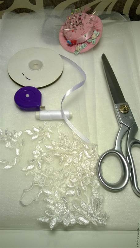 Из фатина вырезаем полоску около 1,5 м, шириной 3 см и пришиваем его по ранее намеченному месту . Это нужно для того, чтобы продеть тесьму и создать фалд.