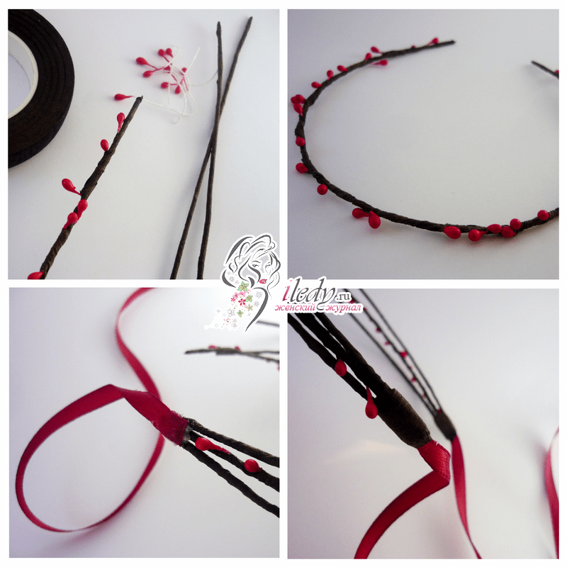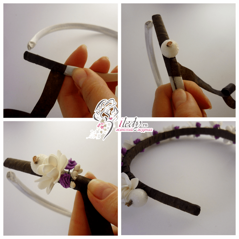 Крепить листочки и цветы нужно последовательно. Сначала нужно прикрепить к ободку несколько листочков, а затем на них приклеить цветочки. Концы проволоки при этом должны строго располагаться на одной линии, а обратная сторона ободка должна быть очень красивой и аккуратной. Когда все цветочки будут закреплены, то нужно прикрыть проволоку несколькими листочками. Ободок можно дополнить красивой ленточкой, если цветами заполнена только его часть.