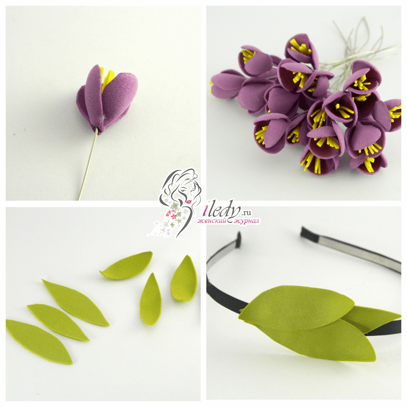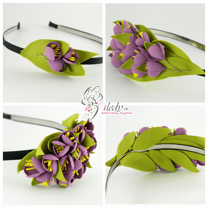 Очень красиво и изысканно в ободке смотрятся цветочки крокуса, которые можно собрать в красивый букетик.