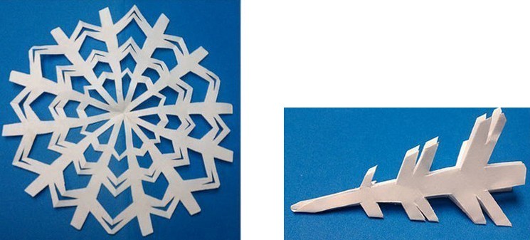 Первый и очень простой способ изготовления объемных шедевров заключается в вырезании обычных снежинок по любому шаблону, но в нескольких вариантах. Затем заготовки складываются пополам и соединяются между собой.