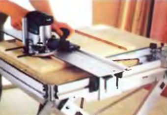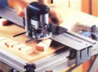 Простая шипорезка для фрезера изготавливается из двух кусков фанеры и пары мебельных телескопических направляющих. Фрезер устанавливается на площадке, имеющей отверстие для инструмента. Площадка крепится к верстаку под углом (для более удобного позиционирования оснастки по высоте), как показано на фото ниже.