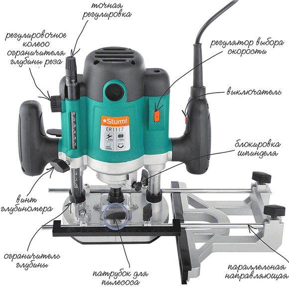 Глубина среза регулируется подъемным механизмом (фиксированное расстояние между штифтом и шайбой), который соединяет между собой электропривод и основание фрезера. Для фиксации расстояния от края заготовки предусмотрена прямолинейная направляющая.