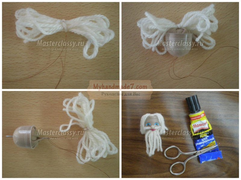 Каркас головы можно сделать из фольги. В шарик из этого блестящего материала «запакуйте» кусок проволоки. Приготовьте соленое тесто для поделок и облепите им шарик. На место глаз вставьте бусины или небольшие пуговицы. И приступайте к лепке лица дедушки. Из податливого теста формируйте щеки, губы.