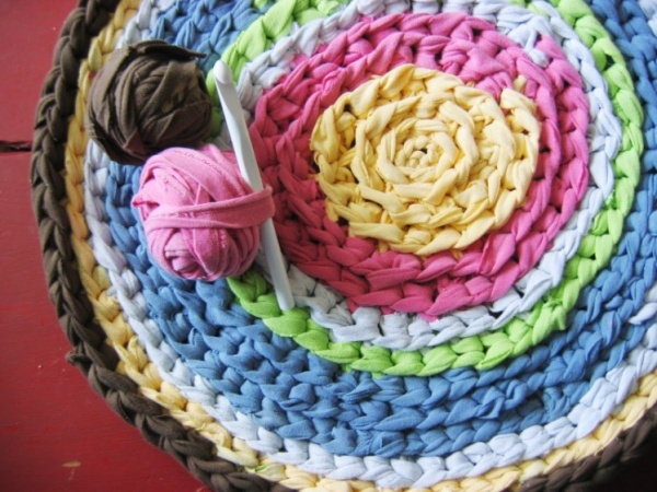 Тут есть два варианта – порезать носки вдоль, связать образовавшиеся «нити» между собой и вязать коврики как из обычной пряжи. Второй вариант – сшивать носочные лоскутки вручную.