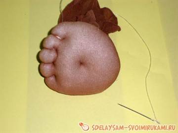 - Чтобы сформировать шею, нужно прошить иголкой по кругу и затянуть. Место шеи затягиваем плотной нитью.