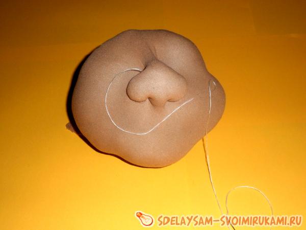 - Обозначить на голове область носа и при помощи утяжек сформулировать носик игрушки, после чего нить вывести наизнанку и закрепить ее там.