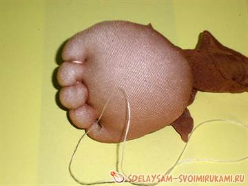 - Обшиваем чулочной тканью. Натягиваем ее между пальцами, прошивая нитками. Рука готова. Делаем вторую аналогично. Пришиваем руки к туловищу. Благодаря каркасной основе их можно будет сгибать.