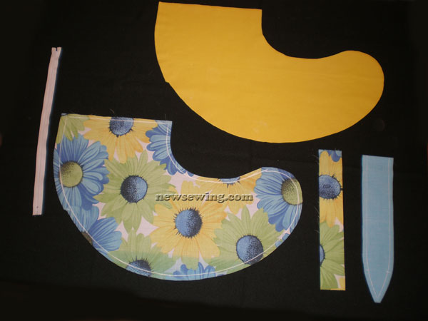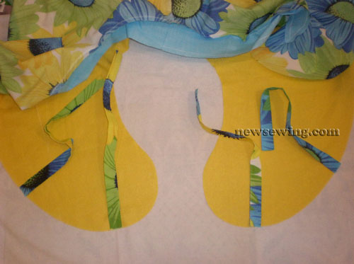 Здесь добавляются завязки, их количество определяете вы. Сделайте надсечки на деталях кроя в местах притачивания завязок соответственно лекалу.