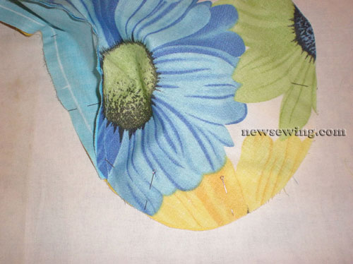 Соединяем внутреннюю вставку с большой деталью, совмещая концы вставки с надсечками на большой детали и надсечки по центру. Можно предварительно зафиксировать булавками или сметочным швом. Стачиваем, шов заутюживаем в сторону вставки.