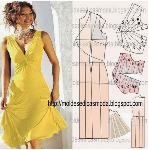 - Желтый сарафан имеет соблазнительную драпировку на лифе. Как ее сделать и соединить части, указано на деталях с цифрами от 1 до 6.