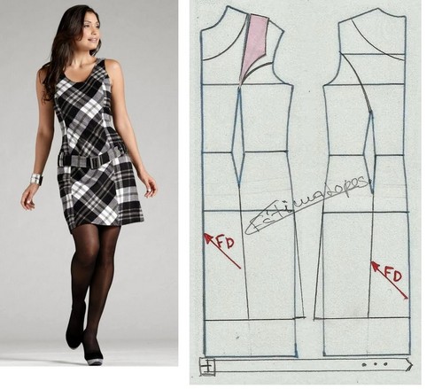 - Модель в клеточку. Чтобы не делать лишних выточек на груди и талии, выполняется подрезной бочок, куда прячется она. Декоративным элементом служит пояс, вшитый между центральной и боковыми сторонами полочки на уровне бедер.