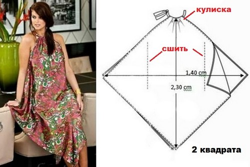 Есть два варианта пошива изделия. Воспользоваться готовой основой платья или топа, как мы это делали, моделируя платья, или простая выкройка сарафана, основанная на квадрате, ромбе. То есть ее можно строить прямо на отрезе. И это не скажется отрицательно на готовой модели.